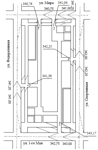 Приведем пример расположения горизонтали с отметкой 342,25 м. вне пределах размостки по ул. 1-го Мая: