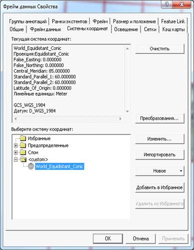 Для настройки переходим в свойства используемого набора слоёв, в свойствах фрейма данных - вкладка «Системы координат».