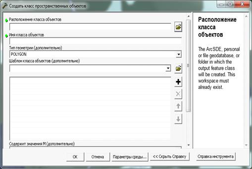 Для того чтобы начать оцифровку, нужно создать класс пространственных объектов для этого переходим в приложение «ArcToolbox» à «Управление данными» à «Классы объектов» à «Создать класс пространственных объектов».