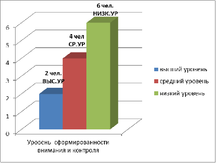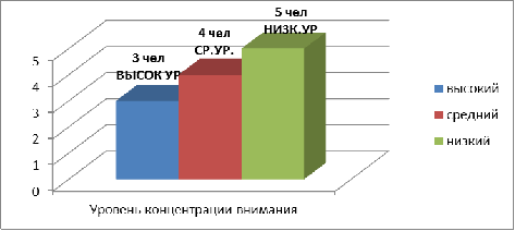 Анализ качественных результатов методики показал, что концентрация внимания находится на высоком уровне у 3 учеников, на среднем уровне у 4 учеников и на низком уровне у 5 испытуемых.
