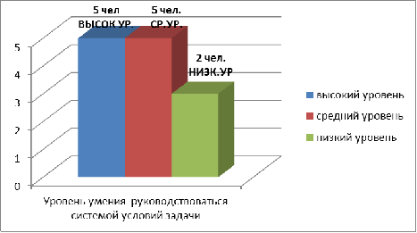 Таким образом, можно сделать вывод, что уровень умений руководствоваться системой условий задачи у учащихся на констатирующем этапе у большинства находится на низком и среднем уровне.