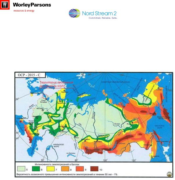 Согласно карте общего сейсмического районирования территории Российской Федерации ОСР-2015 (СП 14.13330.2018 «Строительство в сейсмических районах» Изменение №1 от 01.12.2015 г.) морской (подводный) участок российского сектора проектируемого морского газопровода «Северный поток-2» находится в зоне интенсивности сотрясений 5 баллов шкалы MSK-64 (рисунок 3.1) для средних грунтов. Период повторяемости сейсмических событий - 5000 лет.