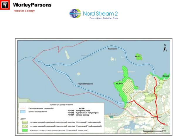 Вариант 2 (Нарвская губа) – площадка КС расположена южнее деревни Большое Кузёмкино на расстоянии порядка 10 км от берега залива. Участок трассы от площадки КСдоплощадкиДОУдлинойпорядкашестикилометров.Выходгазопроводавакваторию Нарвской губы предусматривается в районе деревни Ханике. Данный вариант затрагивает линейной частью газопровода границы ООПТ «Кургальский».