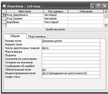 . Код_Виробника - тип даних - числовий, обов’язкове поле, збіги допускаються.