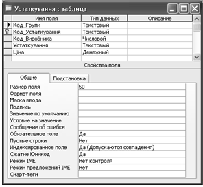 . Устаткування - тип даних - числовий, обов’язкове поле, збіги допускаються, пусті рядки не допускаються.