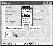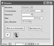 Дана форма дозволяє вносити зміни щодо покупок устаткування. Поля Покупець та Устаткування перетворені в поля зі списком (рис. 6.16). Користувач має змогу обрати потрібного покупця та устаткування. На формі присутня кнопка Ціна на устаткування, що дозволяє за вказаним вище кодом устаткування швидко знайти його ціну. Це спрощує роботу з формою. Кнопка Просмотр чека - дозволяє переглянути інформацію з таблиці Чек.
