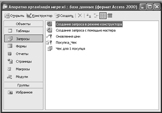 · створення інших об'єктів бази даних: запитів, форм, звітів, макросів та модулів;