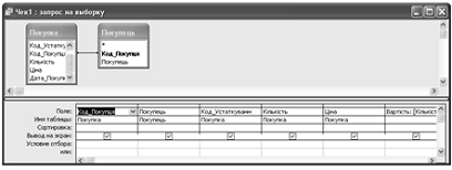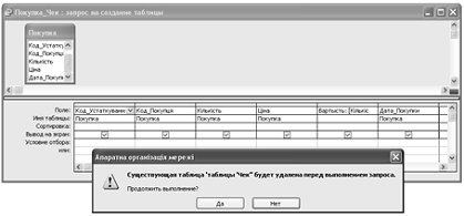 Даний запит - на створення таблиці (Make-Table Query), створює таблицю Чек на основі даних, що містяться в запиті на вибірку. В запиті також міститься обчислюване поле - вираховується вартість покупки.