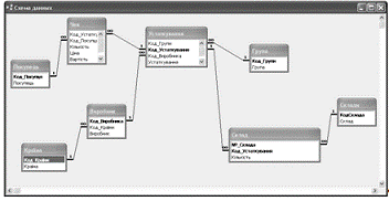 Схема БД магазину мережного устаткування (рис. 38) відображає зв’язки між таблицями, які встановлюються за допомогою зовнішніх ключів. Схема створювалася в такій послідовності: