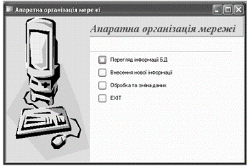 У базі даних, що розробляється в курсовому проекті, була створена кнопкова форма (рис.39).