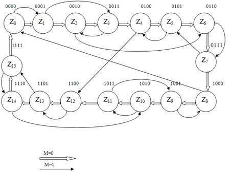 Проектуємо автомат Мура з двома режимами роботи керованими вхідним сигналом М, згідно заданим варіантом №1 (додаток 1). Коефіцієнт лічення - 16. М=0 - прямий код М=1 -код Грея.