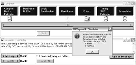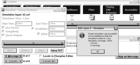 .        Створюємо схему проекту за допомогою Graphic Editor САПР "MAX+PLUS II", здійснюємо компіляцію проекту та проводимо тестування пристрою за допомогою редактора Waveform Editor та модуля "Simulator".
