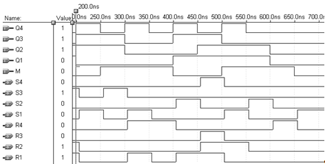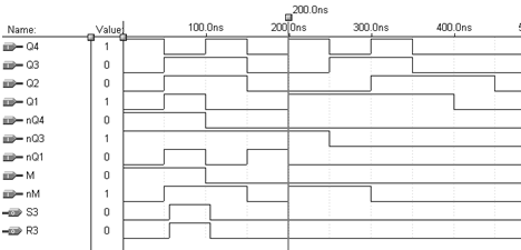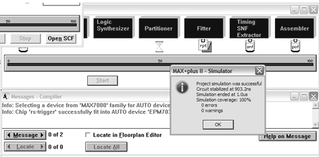 Для цього створюємо файл часових діаграм з розширенням *.SCF, задаємо стани входів, вибираємо виходи і запускаємо "Simulator".