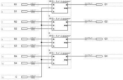 . За допомогою графічного редактора САПР "MAX+PLUS II" створюємо схему пам"яті на основі RS-тригерів:
