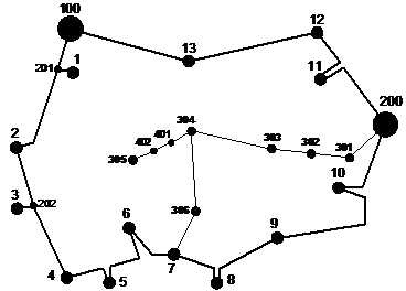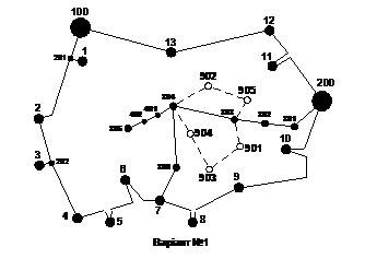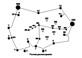 Розрахунок і аналіз режиму вхідної мережі (рисунок 1.1) проводиться з метою вибору з існуючої мережі найкращих за певним критерієм вузлів живлення для 5 нових вузлів споживання електричної енергії. Критерієм вибору цих вузлів може бути: