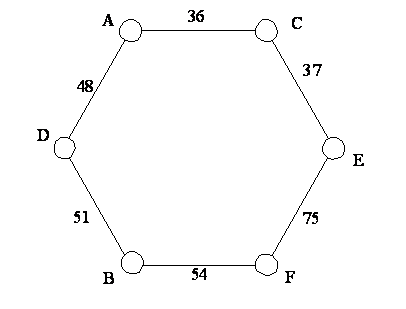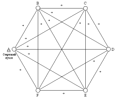 Далі здійснюємо перетворення повнозв’язної топології, що показана на рисунку 1.1, у кільцеву топологію таким чином, щоб сума відстаней між вузлами отриманої кільцевої топології була мінімальною із всіх можливих варіантів кільцевих топологій, які можуть бути виділені як складова частина чарункової топології. ). Синтезуємо кільцеву топологію мережі з мінімальною сумарною довжиною ребер за допомогою алгоритму Дейкстри.
