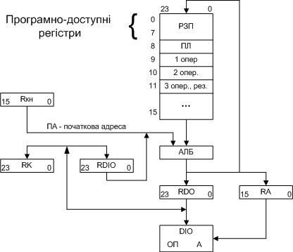 Регістри R0-R7 є регістрами загального призначення (РЗП). Регістр R8 - програмний лічильник (ПЛ). Регістри R9-R15 є програмно доступними, причому R9, R10 використовуються для зберігання операндів після тактів ТО1 і ТО2, а регістр R11 - для запису результату після завершення такту ТО3.
