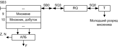 до суми часткових добутків додається множене (R9). Якщо Т=0, до суми часткових добутків додається «0». Утворені суми часткових добутків та множник в RQ зсуваються вправо на один розряд.