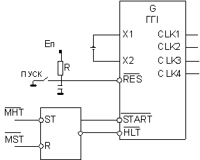 представлена схема підключення кварцового генератора та керування ГТІ. Входи “START” i “HLT”