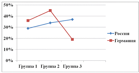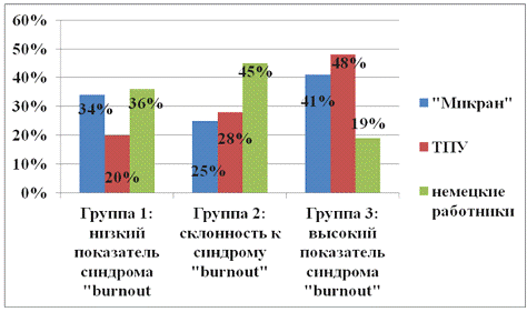 Первая группа, не расположенная к синдрому профессиональному выгоранию, в Германии на 7% больше. Вторая группа, расположенная к «burnout», в Германии на 11% больше. Третья группа больше в Росси на 18% больше.
