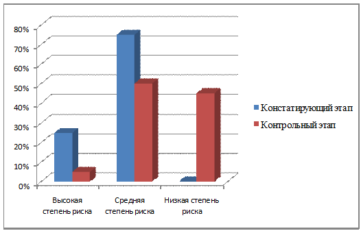 На основе анализа полученных данных, мы наглядно увидели и сделали выводы о том, что: в классе 25% детей с высокой степенью риска и 75% детей со средней степенью риска.