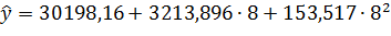 Для прогнозирования на базе полученной модели на одну точку вперед необходимо в нее подставить соответствующее значение временного параметра, т.е. t=8. (Если бы оценки коэффициентов модели были получены без переноса начала координат в середину ряда, то следовало бы подставить в модель значение временного параметра t=16).