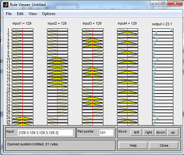 Формування бази правил системи нечіткого виводу здійснюється у вигляді впорядкованого погодженого списку нечітких продукційних правил у вигляді «IF A AND B THEN w= е 1 a+ е 1 b », де антициденти ядер правил нечіткої продукції побудовані з двох простих нечітких висловлювань A, B за допомогою логічних зв'язок «И», a і b - чіткі значення вхідних змінних, що відповідають висловлюванням A і B відповідно, е 1 і е 2 - вагові коефіцієнти, що визначають коефіцієнти пропорціональності між чіткими значеннями вхідних змінних і вихідний змінний системи нечіткий вивід, w - чіткий значення вихідний змінна, визначений в укладення нечіткий правило, як дійсний число.