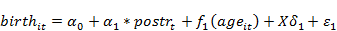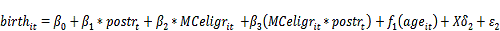 где: - вероятность рождения женщиной ребенка в период t (величина, равная 1 в случае, если женщина i в период t родила ребенка, и 0 во всех остальных случаях);- величина, равная 1 для периода в течение которого действует программа регионального материнского капитала (эта величина проставлялась индивидуально для каждого региона в выборке в зависимости от года начала программы);- величина, равная 1 в случае, если женщина потенциально может получить сертификат на региональный материнский капитал (с учетом региональных особенностей, таких, как число детей и т.д.), и 0 во всех остальных случаях;