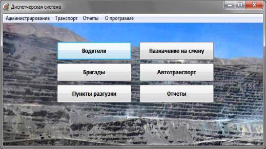 Главное окно программы содержит кнопки для открытия форм «Водители», «Бригады», «Пункты разгрузки», «Назначение на смену», «Автотранспорт» и «Отчеты». Также для открытия этих форм предназначены пункты главного меню приложения.