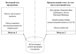 Как показано во введении, общая схема работы инструментальной системы поиска плагиата состоит из двух взаимодополняющих модулей. Первый модуль анализирует исходный код методами анализа исходных кодов (частотного анализа и анализа токенизированной последовательности операторов) в программных модулях студентов на основе пополняемой текстовой базы данных (БД), а второй модуль позволяет анализировать этот же исходный код методами анализа произвольных текстов, интегрирующего структурный анализ кодов (на основе исходного либо токенизированного представления), метода шинглов, дистанции Левенштейна и нахождения наибольшей общей подпоследовательности (longest common subsequence, LCS) для произвольных текстов. Если второй модуль рассматривает произвольный текст как исходный код программы (в модуле не установлен флажок «Текст»), то он использует ту же самую пополняемую БД работ студентов, которую формирует первый модуль.