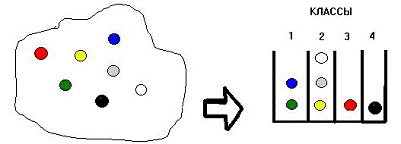Слева изображено неструктурированное множество альтернатив. Справа показано разбиение исходного множества на 4 класса. Можно считать, что каждый класс есть подмножество исходного множества альтернатив. Здесь важно отметить, что классы НЕУПОРЯДОЧЕНЫ друг относительно друга. Т.е. нельзя сказать, что какой-то класс «важнее (лучше, старше, дороже и п.т.)» другого. Например, людей можно классифицировать по полу или национальности. Правильная постановка диагноза - также пример классификации. Компьютерные системы, помогающие врачу ставить диагноз, существуют. И решают они именно задачу классификации, т.е. отнесения больного к нужному классу, который эквивалентен названию болезни. (А как же быть с легкими и тяжелыми заболеваниями? Ведь по определению классы НЕ упорядочены. Действительно, заболевания можно упорядочивать по тяжести, но здесь мы договоримся не принимать это в расчет.)