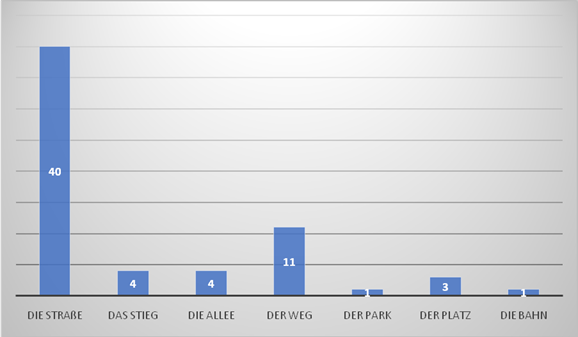 Наиболее популярным является слово «DieStraße» (улица), меньше всех встречаются слова «DerPark» (парк) и «DieBahn» (дорога, путь).