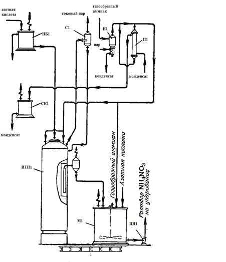 НБ1 - напорный бак; С1 - сепаратор; И1 - испаритель; П1 - подогреватель; СК1 - сборник для конденсата; ИТН1 - аппарат ИТН; М1 - мешалка; ЦН1 - центробежный насос