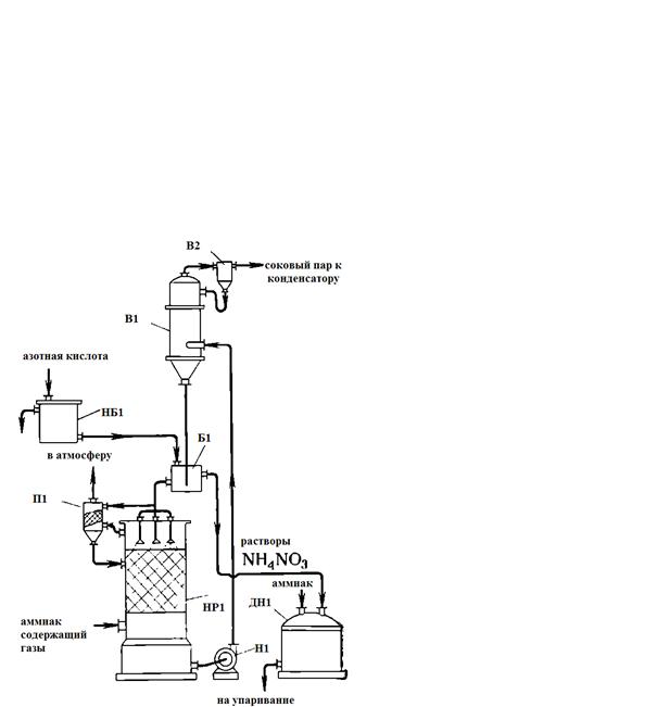 НР1 - нейтральзатор скрубберного типа; Н1 - насос; В1 - вакуум-испаритель; В2 - вакуум-сепаратор; НБ1 - напорный бак азотной кислоты; Б1 - бак (затворсмеситель); П1 - промыватель; ДН1 - донейтрализатор