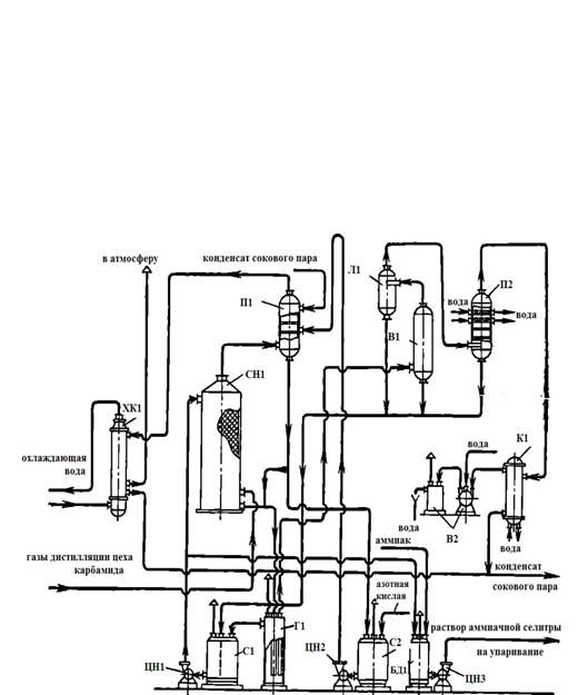 ХК1 - холодильник-конденсатор; СН1 - скруббер-нейтрализатор; С1, С2 - сборники; ЦН1, ЦН2, ЦН3 - центробежные насосы; П1 - промыватель газов; Г1 - гидрозатвор; Л1 - ловушка; В1 - вакуум-испаритель; БД1 - бак-донейтрализатор; В2 - вакуум-насос; П2 - промыватель сокового аппарата; К1 - конденсатор поверхностный