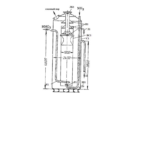 ЛК1 - люк; П1 - полки; Л1 - линия для отбора проб; Л2 - линия вывода растворов; ВС1 - внутренний стакан; С1 - сосуд внешний; Ш1 - штуцер для слива растворов; Р1 - распределитель аммиака; Р2 - распределитель азотной кислоты