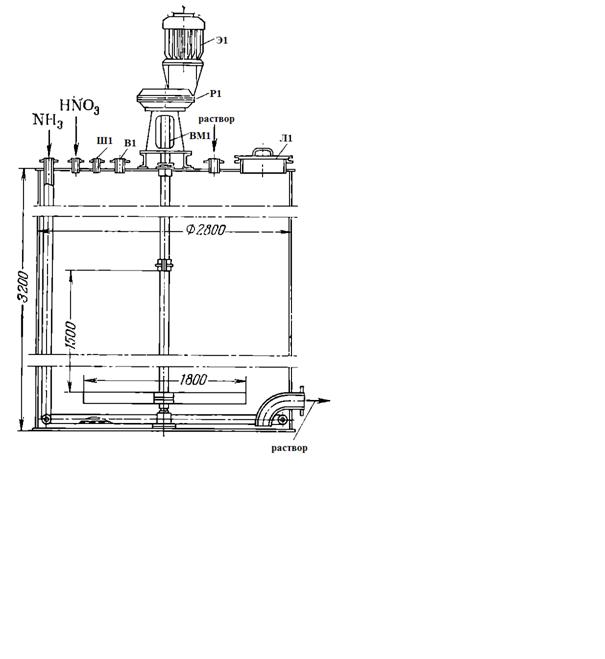 Ш1 - штуцер для установки измерителя уровня; В1 - воздушник; Э1 - электродвигатель; Р1 - редуктор; ВМ1 - вал мешалки; Л1 - лаз