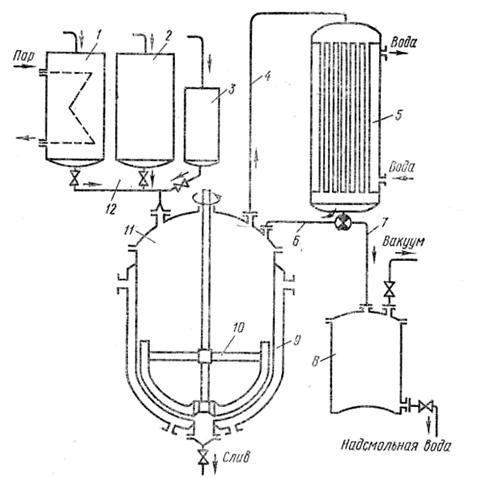 9 - паровая рубашка, 10 - мешалка, 11 - реактор