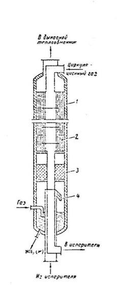 500-515 0С поднимается по центральной трубе 2, проходит по трубкам теплообменника 6, охлаждаясь при этом до 320-3500С, и выходит из колонны.