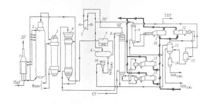 1 – подогреватель газа; 2 – колонна синтеза аммиака; 3 =- подогреватель воды; 4 – выносной теплообменник: 5 – циркуляционное колесо компрессора; 6 – сепаратор жидкого аммиака; 7 – блок аппаратов воздушного охлаждения; 8 – конденсационная колонна; 9 – конденсационная колонна продувочных газов; 10 – испаритель жидкого аммиака на линии продувочных газов; 11 – сборник жидкого аммиака; 12 – испаритель жидкого аммиака на линии танковых газов: 13 – сепаратор; 14 – промежуточная дренажная емкость; 15 – испарители жидкого аммиака; 16 – магнитный фильтр;