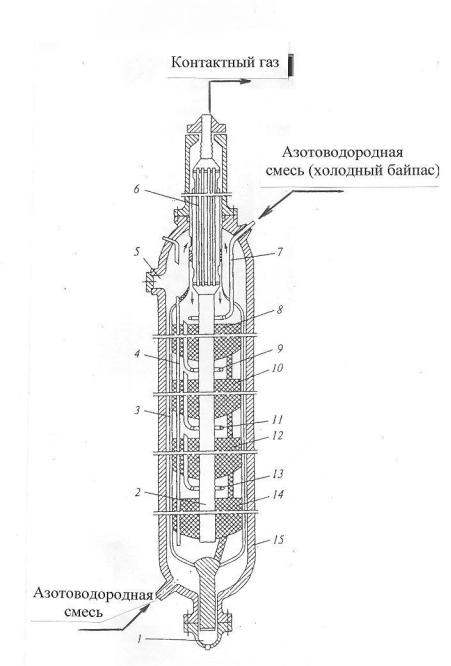 1 – люк для выгрузки катализатора, 2 –центральная труба, 3 – корпус катализаторной коробки, 4 – термопарный чехол, 5 – загрузочный люк, 6 – теплообменник, 7, 9, 11, 13 – ввод байпасного газа, 15 – корпус колонны.