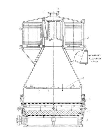 Аммиачно-воздушная смесь поступает в контактный аппарат сбоку, огибает внутренний конус и сверху подается на катализаторные сетки. Верхний штуцер аппарата перекрыт предохранительной взрывной пластиной, которая разрывается в случае внезапного повышения давления внутри аппарата.