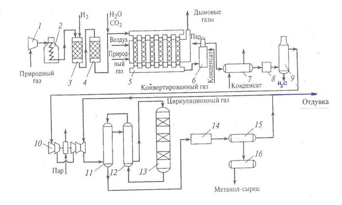 1, 10 –турбокомпрессоры, 2 –подогреватель природного газа, 3 –реактор гидрирования сернистых соединений, 4 –адсорбер, 5 –трубчатый конвектор, 6 –котел-утилизатор, 7, 11, 12 – теплообменники, 8, 14 –холодильники-конденсаторы, 9, 15 –сепараторы, 13 –колонна синтеза, 16 –сборник.