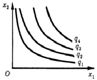 Будем считать, что увеличение затрат одного из ресурсов при неизменных затратах другого позволяет увеличить выход продукции. Это значит, что производственная функция - возрастающая функция каждого из своих аргументов. Через каждую точку плоскости ресурсов с координатами х1, х2 проходит единственная изокванта. Все изокванты имеют отрицательный наклон. Изокванта, отвечающая большему выходу продукта, располагается правее и выше изокванты для меньшего выхода. Наконец, все изокванты будем считать выпуклыми в направлении начала координат.