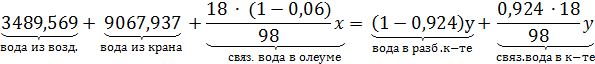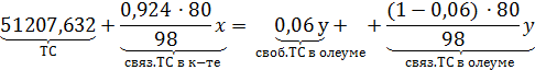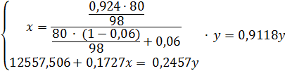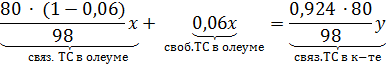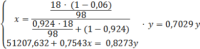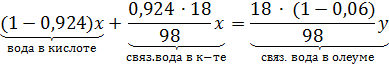 за «у», а массовый поток 92,4%-ой кислоты - «х», можно составить материальный