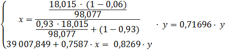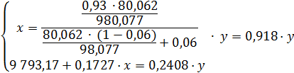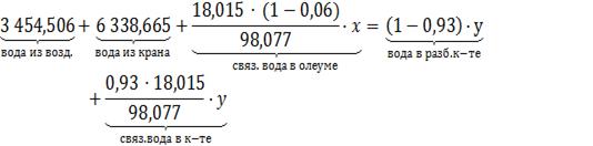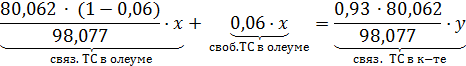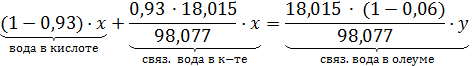 Таким образом, обозначив массовый поток олеума за «у», а массовый поток 93%-ой кислоты - «х», можно составить материальный баланс по воде и по «связанному» триоксиду серы (ТС):
