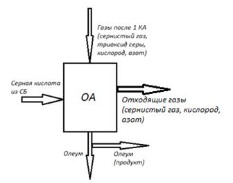 Для расчета олеумного абсорбера (ОА) необходимо знать все потоки входящие и выходящие из него. Входящими потоками будут являться: поглощенный триоксид серы и поступающая из сушильной башни 93%-ая кислота, а выходящими - олеум с 6% свободного триоксида серы.