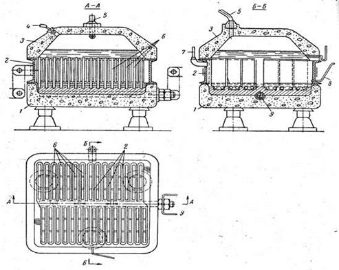 - бетонное днище; 2 - стальной катод; 3 - бетонная крышка; 4 - труба для подачи рассола; 5 - труба для отвода хлора; 6 - графитовые аноды; 7 - штуцер для удаления водорода; 8 - трубка для слива электролитического щелока; 9 - медный токоведущий стержень.