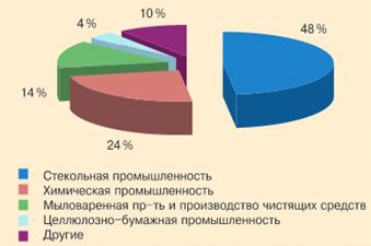 В потреблении каустической соды на первое место выходит химия и нефтехимия (41,9%), что неудивительно. Гидроксид натрия участвует во многих органических реакциях, а так же является сырьем для производства гипохлорита натрия. На втором месте - целлюлозно-бумажная промышленность (19,3%), а на третьем - металлургия (10,2%). [7]
