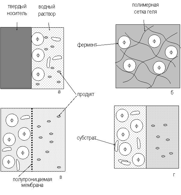 Рис. 5. Способы иммобилизации ферментов: а - адсорбция на нерастворимых носителях, б – включение в поры геля, в – отделение фермента с помощью полупроницаемой мембраны, г – использование двухфазной реакционной среды
